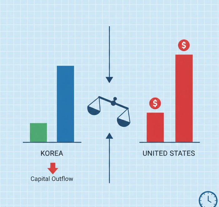 한국 금리가 미국보다 현저히 낮아지면, 더 높은 수익률을 찾아 외국인 투자 자금이 한국 증시나 채권 시장에서 이탈하여 미국으로