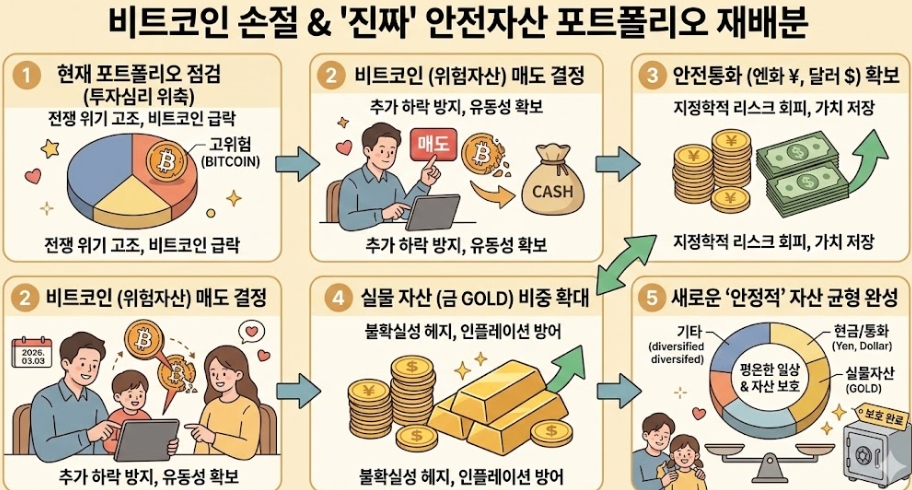 2026년 3월 미국과 이란 전쟁 발발! 비트코인이 디지털 금의 지위를 잃고 폭락한 진짜 이유와 엔화와 금으로 몰리는 글로벌 자금의 흐름을 분석합니다. 아이 아빠가 전수하는 위기 속 "계좌 리밸런싱" 실전 전략을 지금 확인하세요.