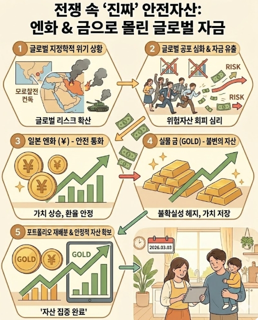 반면 전통적인 안전자산인 엔화와 금은 이름값을 톡톡히 하고 있습니다. 전쟁 공포에 엔화 환율은 급등하고 금값은 연일 신고가를 경신 중입니다. 전 세계 큰손들은 위기가 오면 결국 국가의 신용이 뒷받침되는 통화나 물리적 실체가 있는 자산으로 회귀한다는 사실을 다시 한번 각인시켰습니다.
