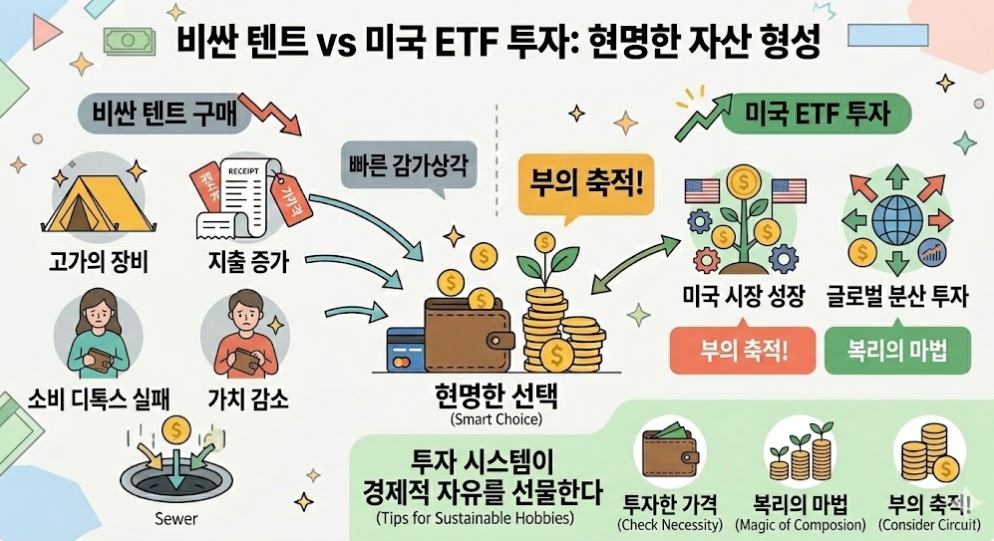 등산과 캠핑 풀세트 긁다가 노후 파산 온다? 장비병 탈출해 1,000만 원 아끼고, 그 돈으로 미국 ETF와 연금저축에 투자해 1억 만드는 역발상 재테크 전략! 당신의 취미를 자산으로 바꾸는 실전 소비 디톡스 가이드를 지금 확인해 보세요.
