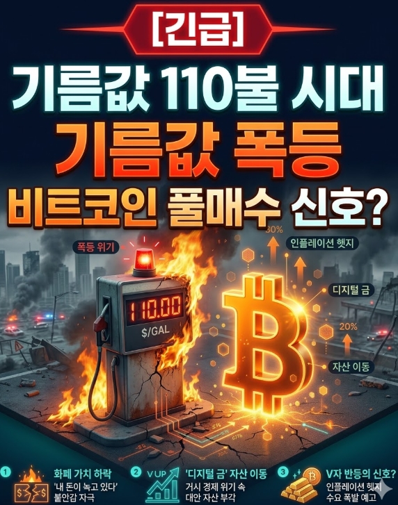 국제 유가 110달러 돌파! 기름값 폭등과 화폐 가치 하락 속에서 비트코인이 인플레이션 헤지 수단으로 주목받는 이유를 분석합니다. 스태그플레이션 시대, 개미들의 필승 재테크 생존 전략을 확인하세요.